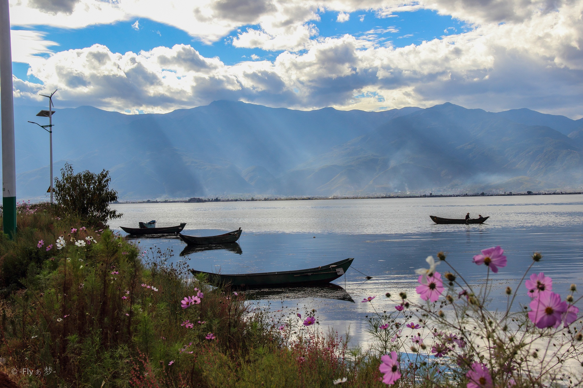 第三张,摄于16:18环海东路,位于双廊镇与挖色镇中间。遥相呼应着第二张的渔船,这里的渔船驶向光芒射下的地方,犹如听到了天堂的呼唤在靠近在倾听。近景湖边的花朵是一个很好的点缀,衬托天堂的美。